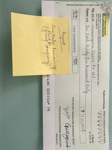 Rotary Bangalore Spandana issued a cheque of ₹1,35,000 to Sanmarga . . .